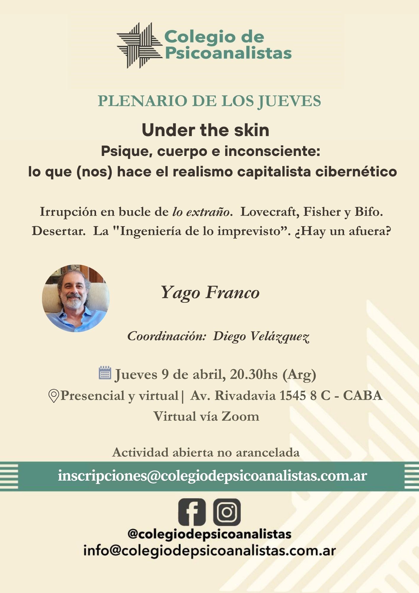 - Gustavo del Cioppo: «La condición hibridante: cuerpos, datos, interficies y presencialidades. Una clínica en tiempos de Inteligencia Artificial» | Jueves 26 de marzo 2026