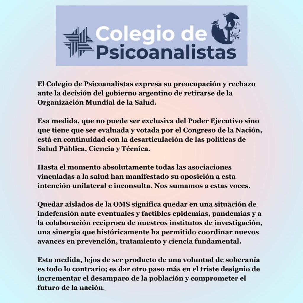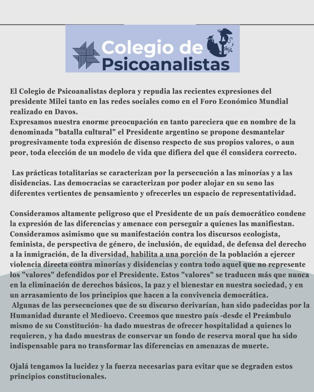 La Asociación Colegio de Psicoanalistas y los profesionales de salud mental que la constituyen llamamos a la reflexión a lxs comunicadorxs sociales. En ningún caso debiera justificarse la indelicadeza de juzgar y exponer públicamente consideraciones acerca de la salud mental de un oponente político ni de ninguna persona. Se atraviesan límites que trascienden la intencionalidad de quien opina y pueden ser tremendamente peligrosos en sus consecuencias. Consideramos que la amplia difusión de la palabra de estxs comunicadorxs tiene efectos materiales y produce consecuencias irreversibles, hiriendo y dañando a una importante porción de la población y a sus familias que, precisamente por su vulnerabilidad, debieran ser protegidas por la comunidad toda.